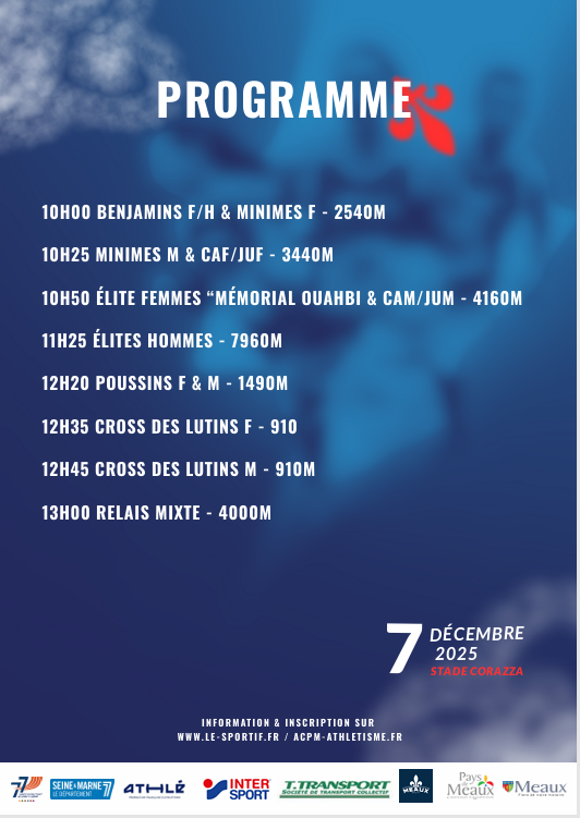 L’ACPMEAUX a organisé son traditionnel cross de Meaux le 8 décembre 2024. Une grande réussite cette année avec plus de 30 clubs présents. Veuillez trouver le lien pour les résultats. https://bases.athle.fr/asp.net/liste.aspx?frmbase=resultats&frmmode=1&frmespace=0&frmcompetition=285290&frmposition=0